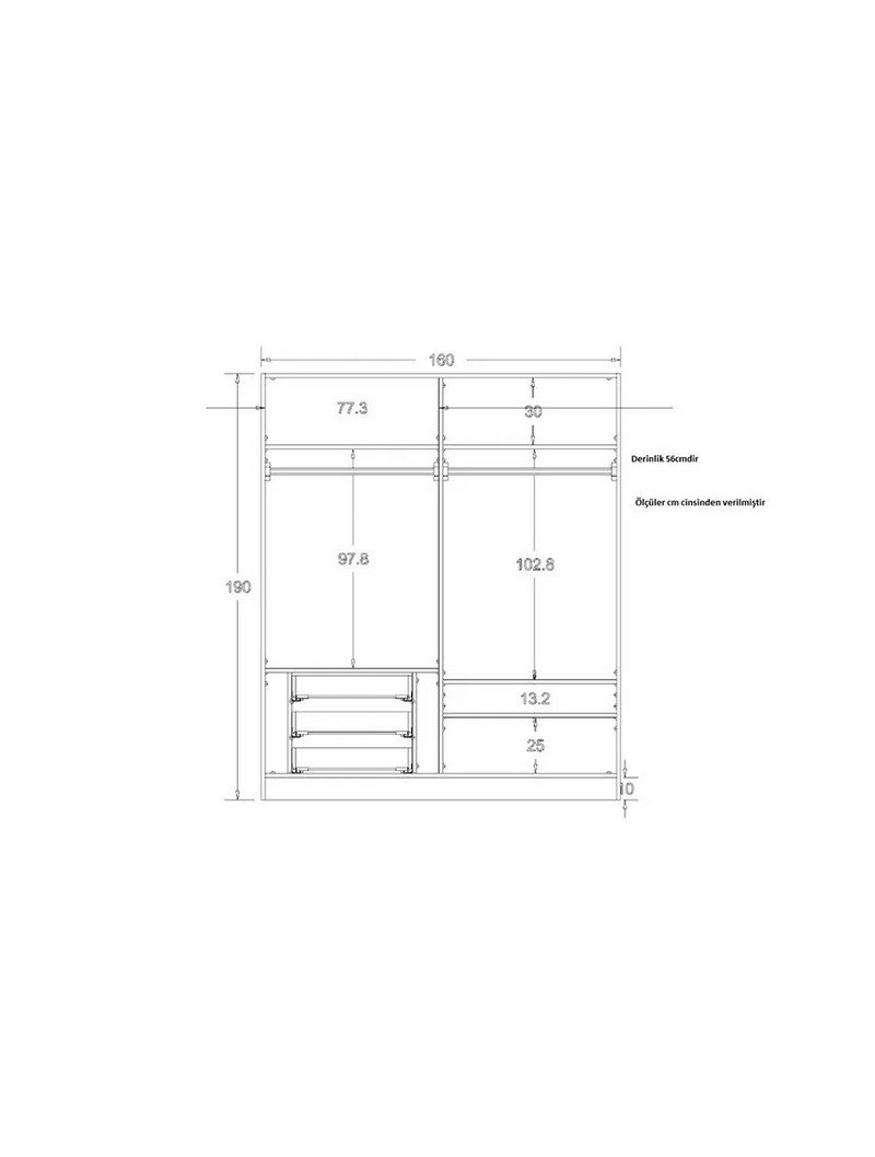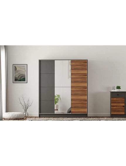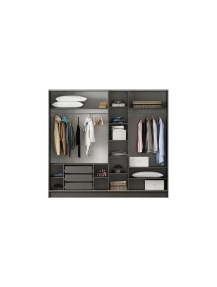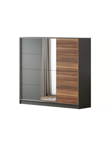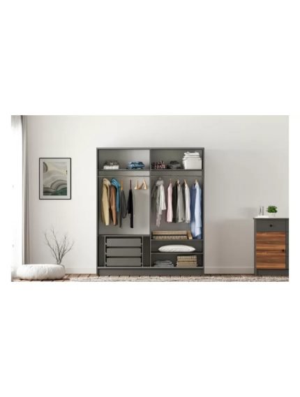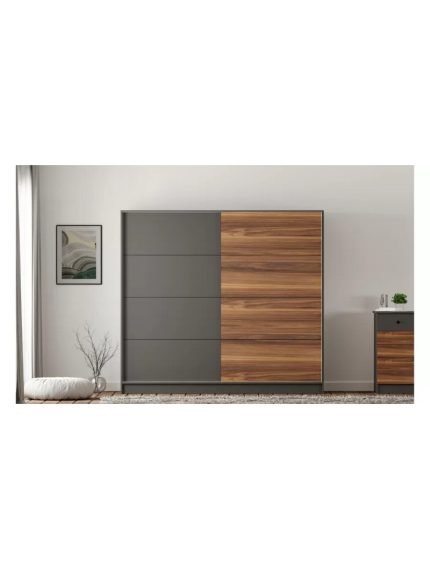 Kasa: Mat füme Kapaklar: Füme ve ahşap desen 3 adet gizli çekmece sistemi 4 adet sabit raf 2 adet alüminyum askılık |