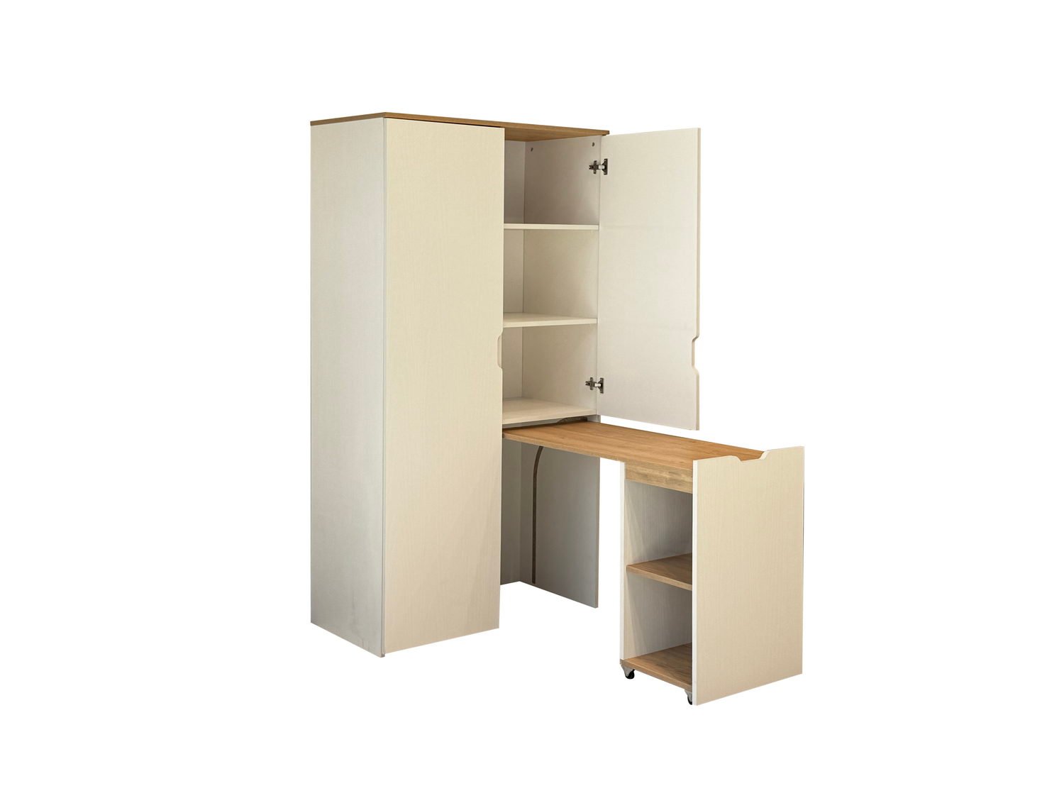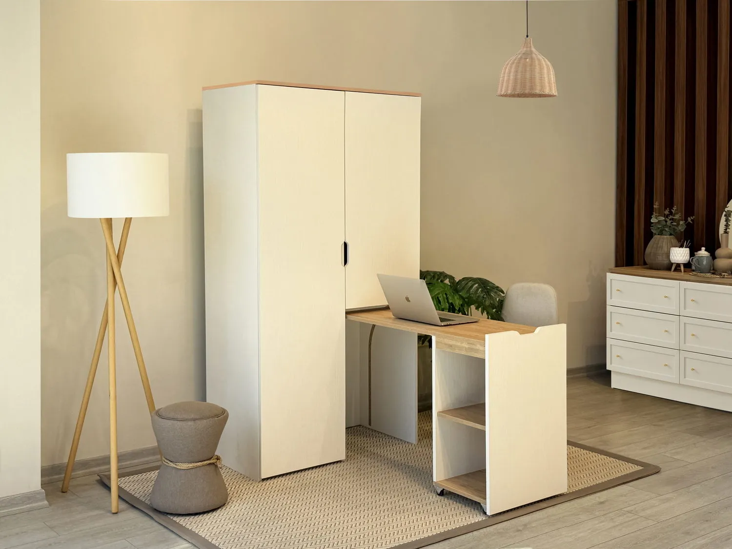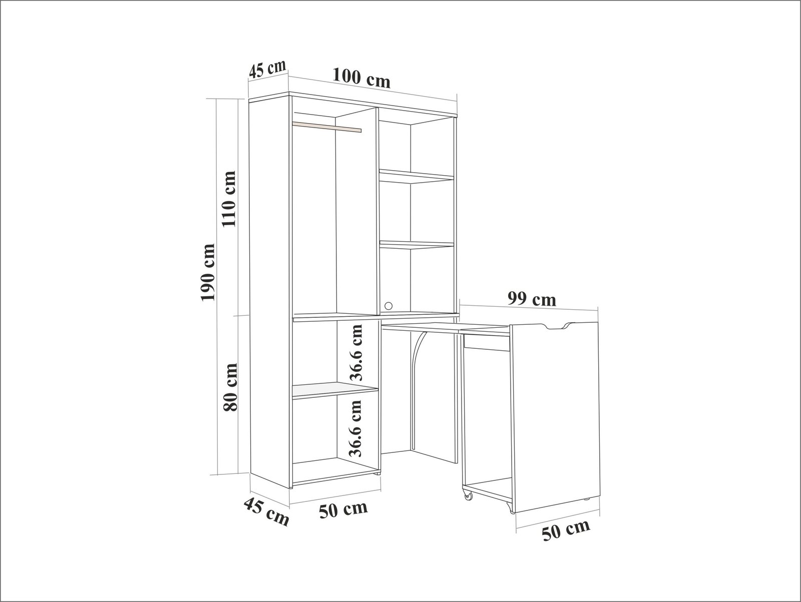 Ürün Ölçüleri:100 x 45 x 190MASA KAPALI : 100 X 190 X 45 cmMASA AÇIK : 100 X 190 X 144 cmMASA ÖLÇÜSÜ : 47 X 75 X 97 cmGardırobun ön kısmında yer alan katlanabilir masa, ihtiyaç duyduğunuzda kolayca açılarak çalışma alanına dönüşür; kullanmadığınızda ise yer kaplamadan kapatılarak alan tasarrufu sağlar.; Özellikle küçük yaşam alanları, genç odaları ya da home office köşeleri için ideal olan bu tasarım, fonksiyonelliği ve şıklığı bir araya getirir.; Gardırop bölmesindeki raf ve askılık sistemi sayesinde giysi, belge veya eşyalarınızı düzenli bir şekilde saklayabilir; masa bölümünde ise konforlu bir çalışma ortamı yaratabilirsiniz.; Görsellerdeki sandalye ürüne dahil değildir.